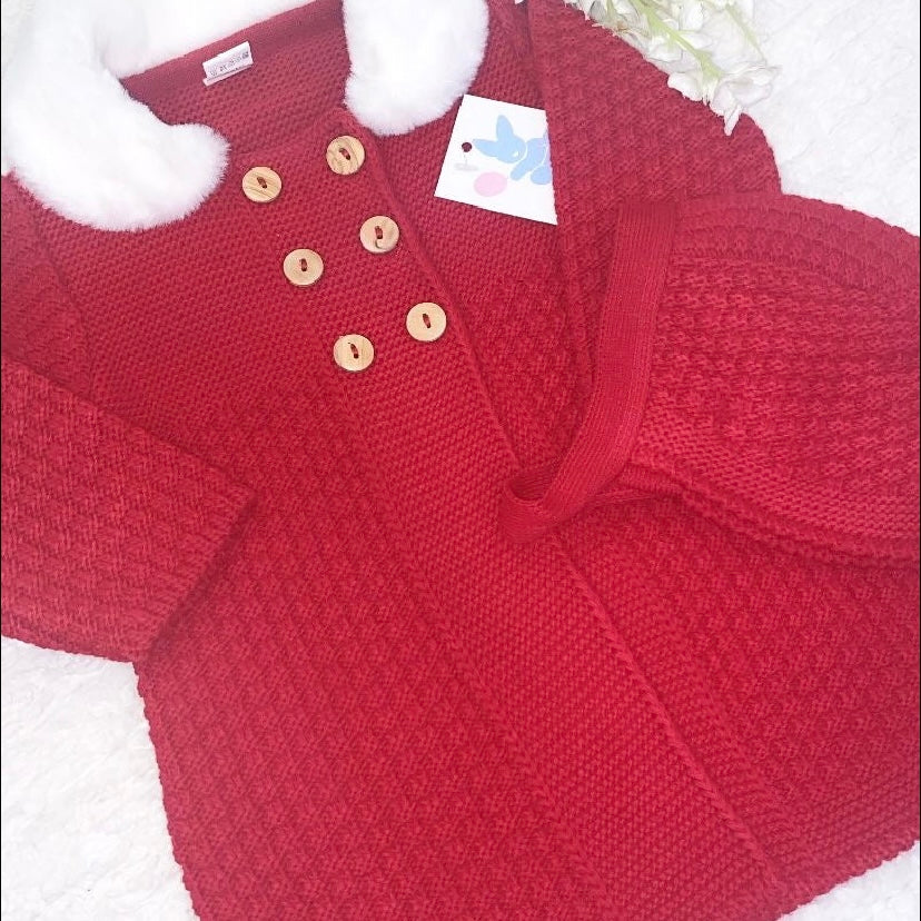 Red knitted coat and bonnet set finished off with a fur collar and double breasted buttons